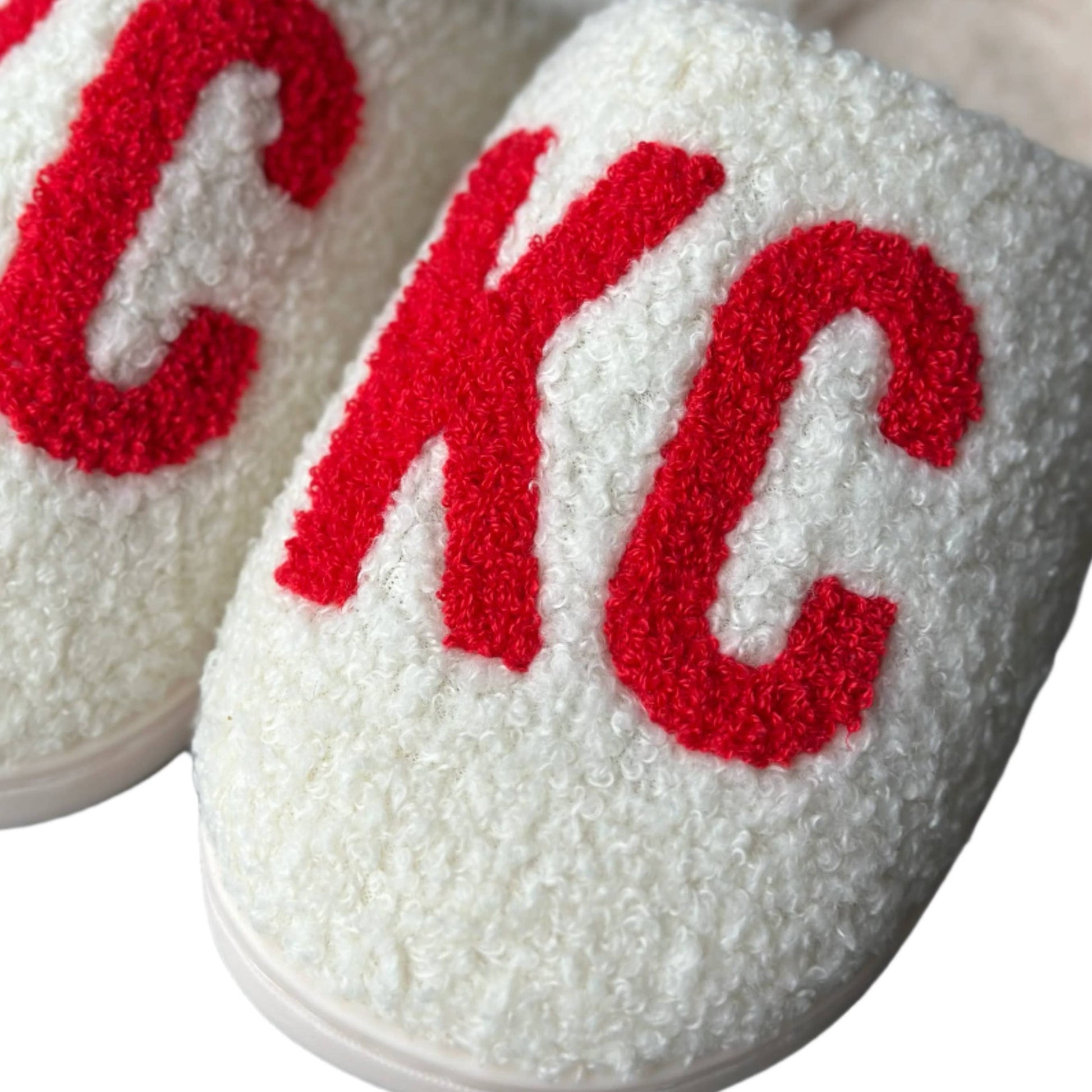 Step into cozy comfort and standout style with our Red KC Slippers! Made from ultra-soft, fuzzy fabric, these slippers are perfect for relaxing at home or tackling your daily routine in total comfort. Designed with a comfy fit and a cute rubber sole, they're just as great for quick trips outside as they are for indoor lounging. Featuring a bold red and white "KC" embroidered design, these slippers are the perfect accessory for everyday wear—or cheering on your team in style. Add the Red KC Slippers to your seasonal essentials! Packaged with a plastic hanger inside a mesh bag, with Carly Rae Studio logo tag on the sole (shown in 3rd photo, packaging photo) Care instructions: Hand wash in warm water, hang to dry. Size guide: S/M fits women's sizes 6–7 M/L fits sizes 8–9 L/XL fits size 10